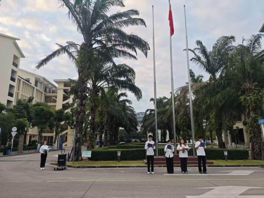 伴随着晨曦微光,国旗护卫队迈着整齐步伐护送国旗入场。在雄壮的国歌声中,五星红旗冉冉升起,全体师生面向国旗庄严宣誓。我院学生代表做国旗下演讲,号召青年学子勇担时代使命,将个人理想融入自贸港建设浪潮。随后,由25级学生代表共同演绎诗朗诵,以激昂文字展现海洋强国建设的壮丽图景。